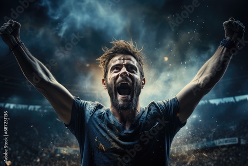 Enthralled by the electrifying music, a concert-goer stands with his mouth agape and hands raised in euphoric surrender