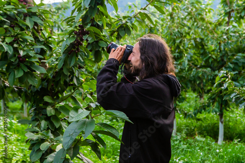 Enthusiast photographer enjoying his journey to the industrial cherry orchard. Young guy taking photos of sweet lapins cherries in a sunny day