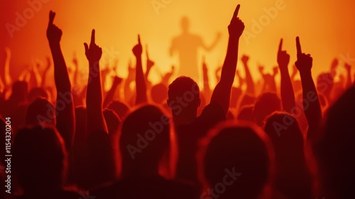 Enthusiastic Crowd with Raised Hands at a Concert in Orange Light