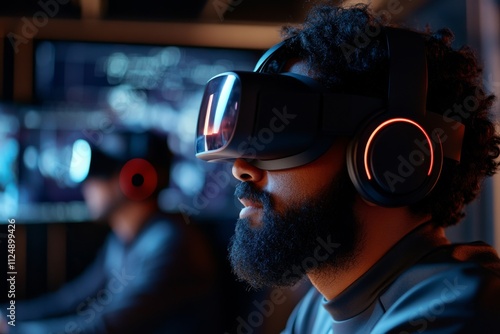 Enthusiastic gamers engage in virtual reality experience at a modern gaming lounge in the evening