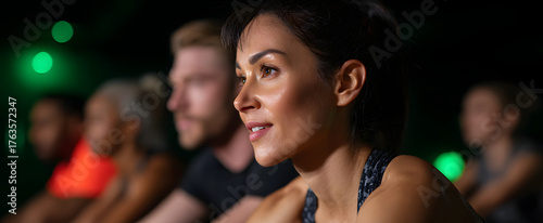 Enthusiastic group energetically powering through a challenging dynamic indoor cycling class together