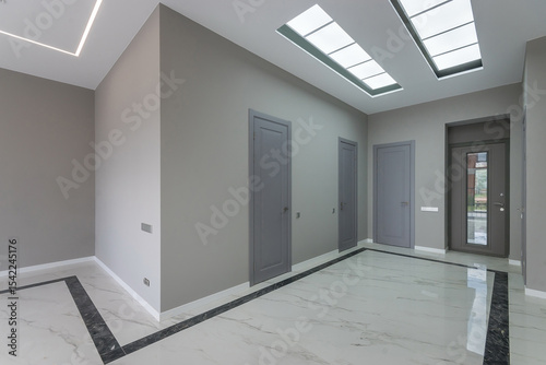 Entrance hall in a luxurious country house. Ceiling with windows, entrance door with glass window. Unfurnished.