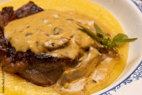 Entrecot with funghi sauce and creamy polenta.
