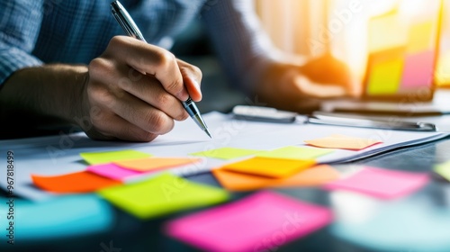 Entrepreneur brainstorming ideas for a business plan on a large notepad, startup concept