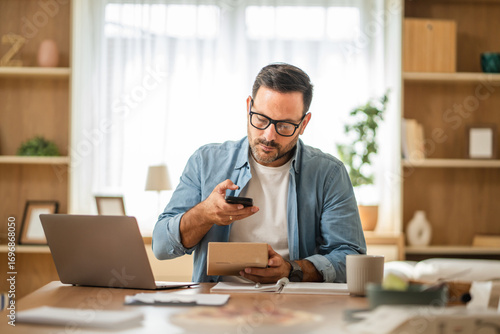 Entrepreneur managing online orders and shipping using smart phone