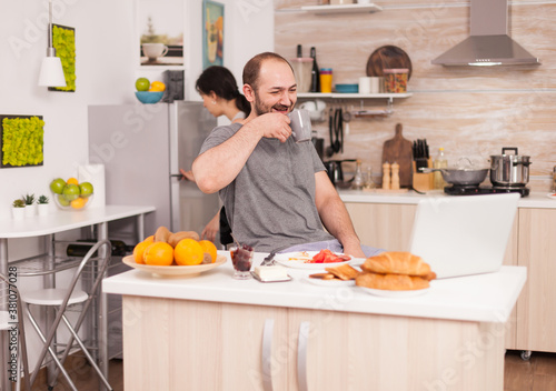 Entrepreneur working from home while eating breakfast in kitchen, wearing pajamas enjoying roasted bread with butter. Freelancer working online via internet using modern digital technology