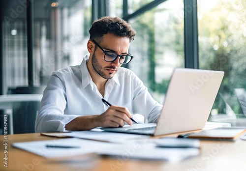 Entrepreneur Writing Goals in Modern Home Office with Laptop and Papers