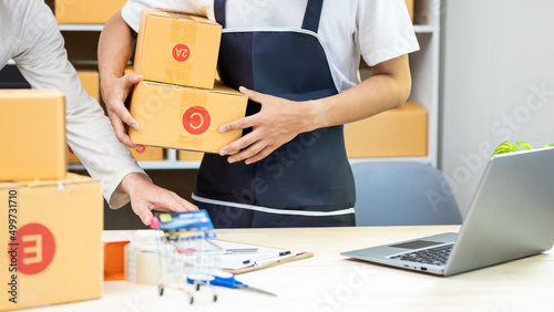 Entrepreneurs Small Business SME Independent men work at home Use smartphones and laptops for commercial checking, online marketing, packing boxes, SME sellers, concept, e-commerce team, online sales