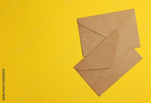 Envelopes made of parchment paper on yellow background, flat lay. Space for text
