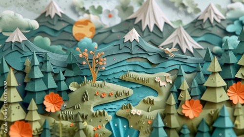 Environment day papercraft-style Earth with elements that appear stitched together like a patchwork quilt, combining forests, rivers, and wildlife in an artistic way.