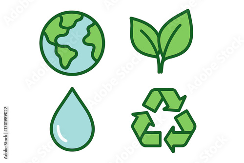 Environmental conservation symbols vector set with Earth globe, green leaves, water droplet, and recycling arrows icons, eco-friendly sustainability, green energy concepts illustration