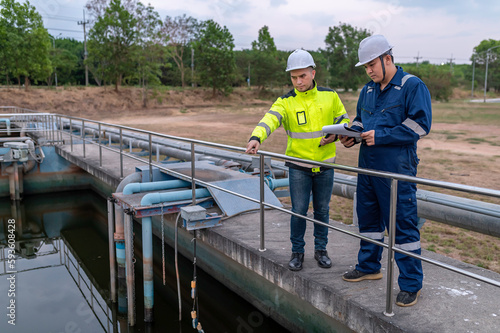 Environmental engineers work at wastewater treatment plants,Water supply engineering working at Water recycling plant for reuse,Technicians and engineers discuss work together.
