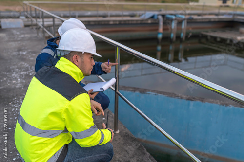 Environmental engineers work at wastewater treatment plants,Water supply engineering working at Water recycling plant for reuse,Technicians and engineers discuss work together.