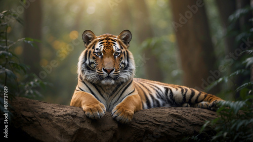 Environmental Harmony Depict the tiger in a setting where it coexists peacefully with the surrounding forest