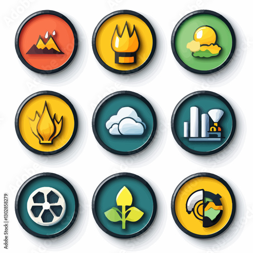 Environmental icons depicting nature, energy, and industry, in a modern style