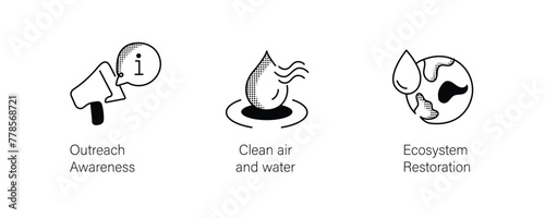 Environmental Icons Set. Clean Air and Water, Ecosystem Restoration, Outreach Awareness. Editable Stroke Icons.