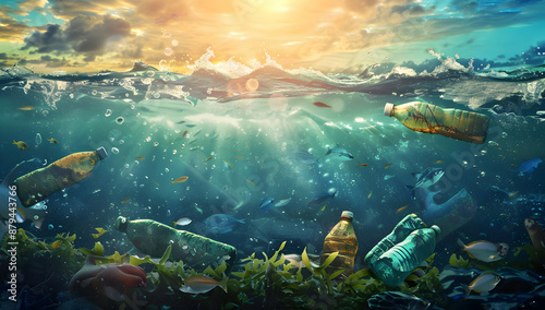 Environmental impact of plastic pollution in the ocean with floating bottles and marine life under sunlight, highlighting ecological issues.