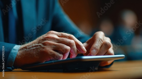 Environmental Lawsuit concept. Hands typing on a tablet device in a professional setting.