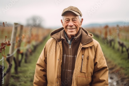 Environmental portrait photography of a glad old man wearing a warm parka against a vineyard background. With generative AI technology