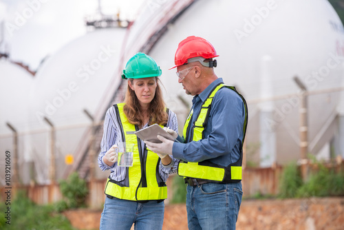 Environmental scientists or workers, wearing safety helmets and gloves, examining waste materials along a shoreline are large industrial tanks environmental waste water or pollution effects concept.
