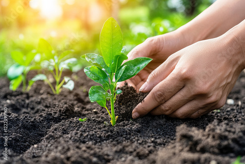 Environmental sustainability and tree planting concept showing nurturing hands holding young green saplings in rich soil for eco-friendly gardening, reforestation, and nature conservation
