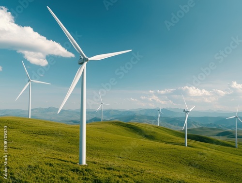 environmental sustainability eco friendly policy, Wind turbines on rolling green hills under a clear blue sky, symbolizing renewable energy and sustainability.