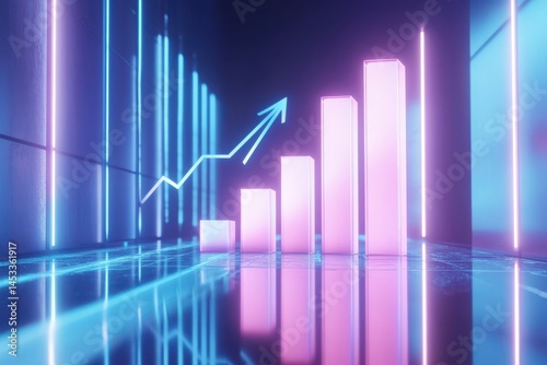 Envision a futuristic financial growth chart showcased through a glowing white bar graph,