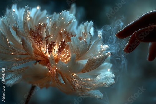 Ephemeral Bloom: A luminous, ethereal flower blossoms, its petals touched by a delicate hand amidst a dreamy, atmospheric haze, evoking wonder and serenity.