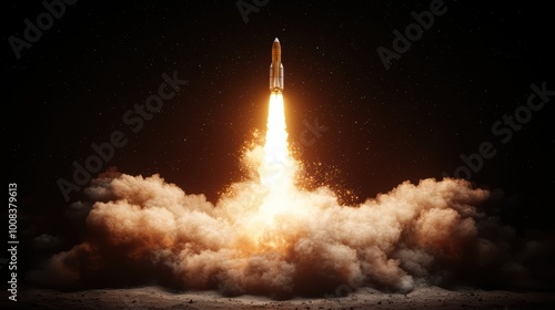 Epic Lunar Takeoff: Rocket Launch in Mystical Landscape with Deep Shadows and Celestial Wonders