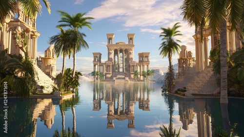 Epic Palatial Complex Rising from Tranquil Waters Under Clear Sky