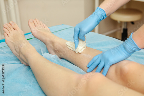 Epilation wax in the spa salon. Beautician imposes wax on women's legs. Close-up.