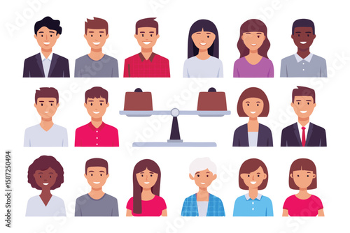 Equality and Balance in the Collective: A diverse group of people are shown together with a scales, visually communicating equality and balance.