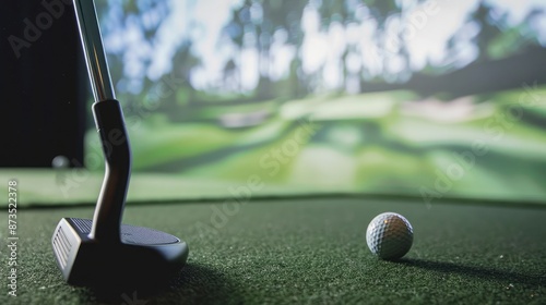 Equipment for screen golf, featuring a putter and ball with a virtual course displayed on the screen background