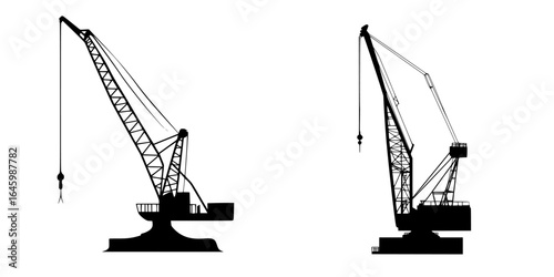 Equipment used for construction and excavation. Two cranes are shown against a white background