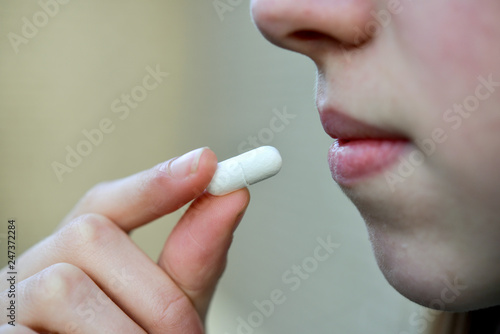 Erkältetes krankes Mädchen nimmt Tablette - Nahaufnahme