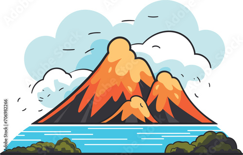 Erupting volcano with lava, clouds and river. Stylized natural disaster scene. Cataclysm and majestic force of nature vector illustration.
