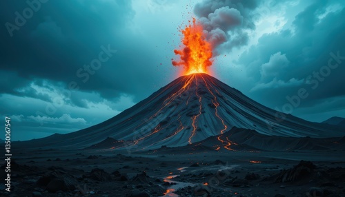 Erupting Volcano with Lava Flow Under Dramatic Cloudy Sky