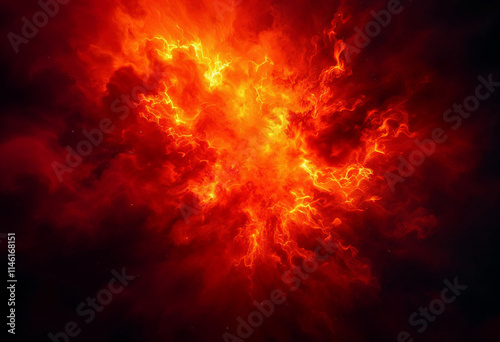 Eruptive flame effect, glowing yellows and deep reds, smoke creating depth