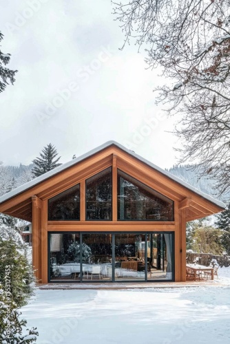 Escape to a cozy winter retreat featuring sleek modern architecture, i situated in a serene landscape blanketed by snow. This charming getaway is embraced by majestic pine trees and stunning mountains