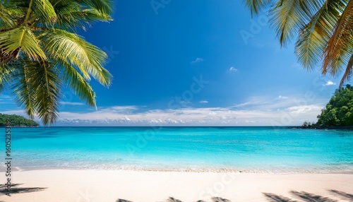 escape to paradise turquoise ocean meets clear sky on tropical beach vacation framed by palm trees and distant horizon perfect vacation spot