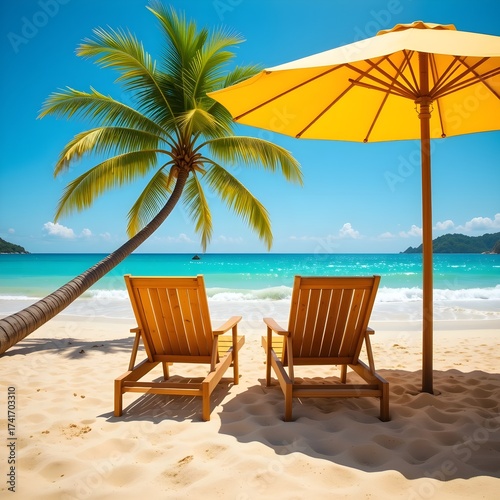 Escape to paradise with a stunning beach view featuring turquoise water, soft sand, palm tree, and inviting chairs under a bright yellow umbrella