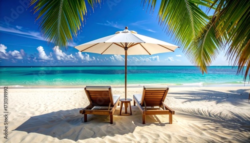 Escape to paradise with pristine white sands, turquoise waters, and inviting lounge chairs under a sunny sky, perfect for relaxation and tropical dreams.