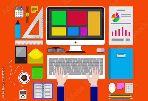 Espace de travail - Bureau et ordinateur - Vecteur - Concept plat