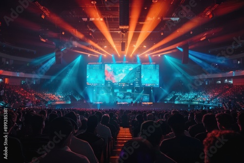 E-sports arena, filled with cheering fans and colorful LED lights. Players compete on a large stage