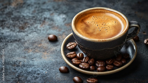 Espresso coffee cup with beans on vintage table. Coffee background