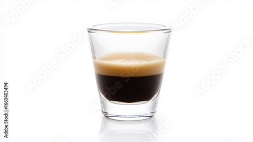Espresso shot glass with crema top, (clean modern detail, white isolated background