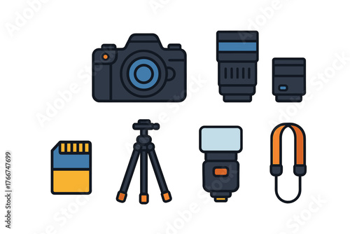 Essential digital photography gear icons including camera body, lens, tripod, and flash