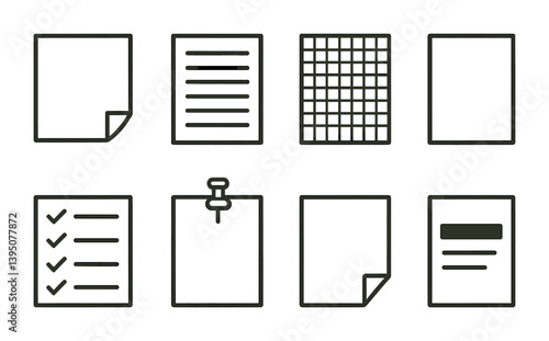 Essential document icons set: 8 linear office and productivity illustrations