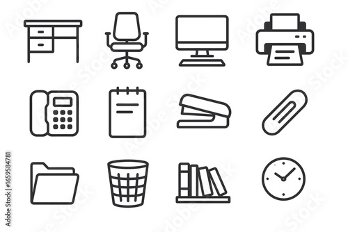 Essential office supplies: desk, chair, computer, printer, phone, notepad, stapler, paperclip, folder, trash bin, bookshelf, clock