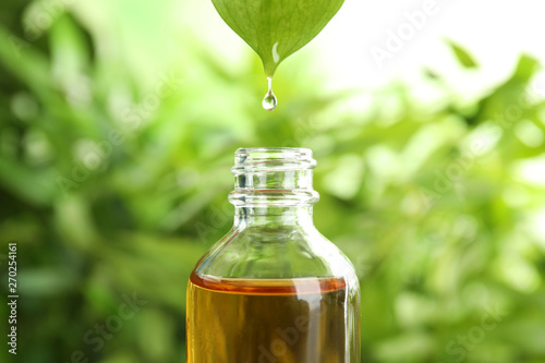Essential oil dripping from leaf into glass bottle on blurred background
